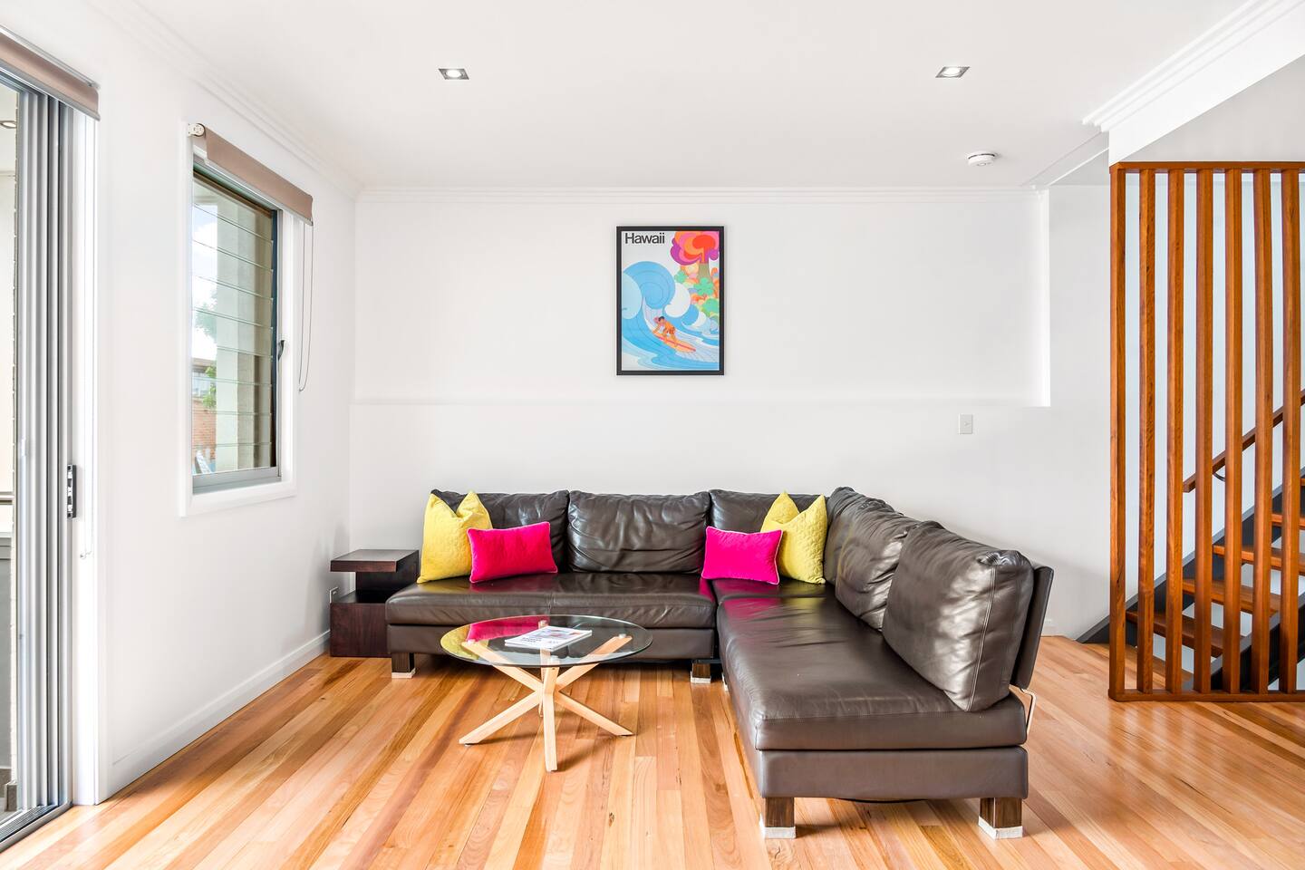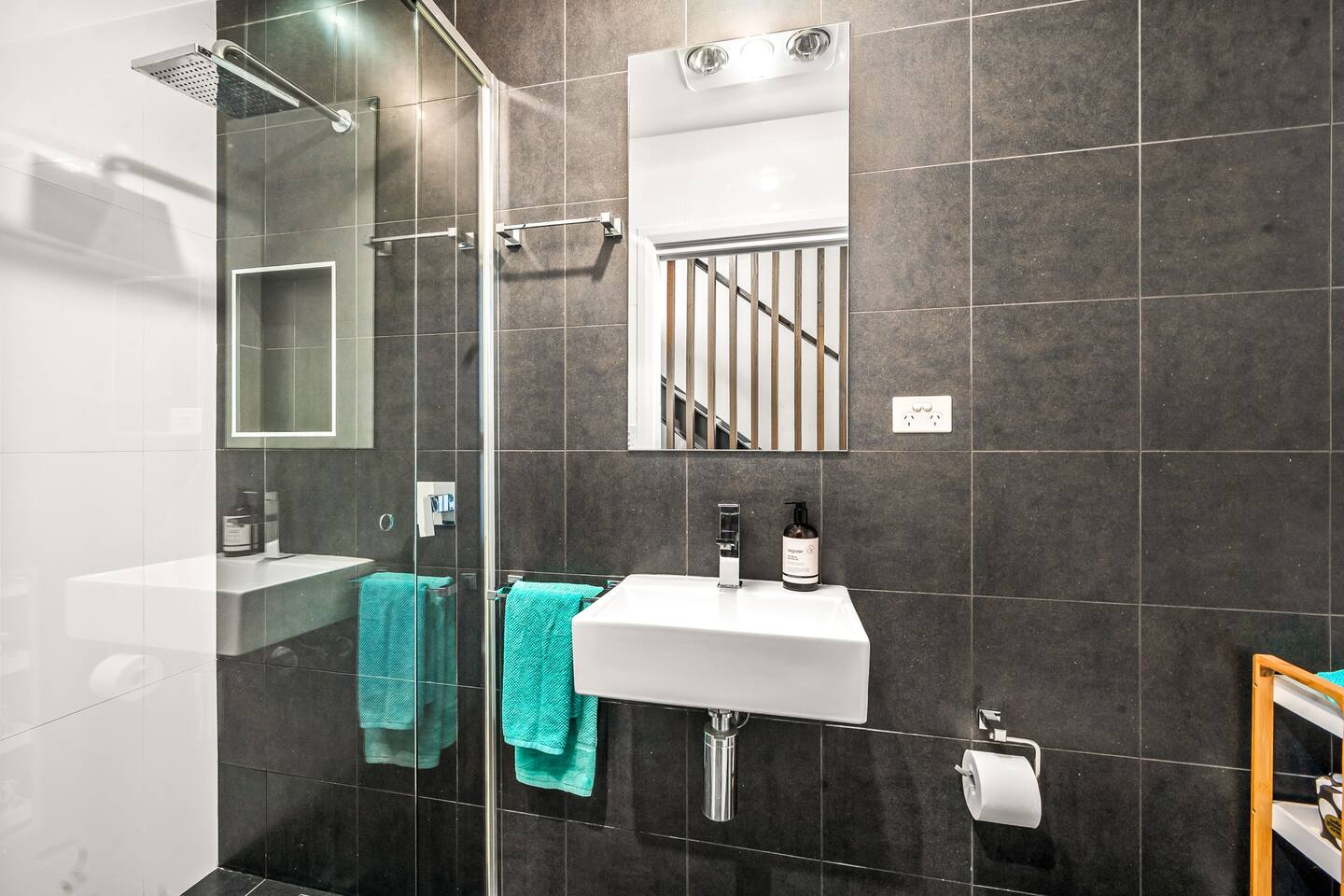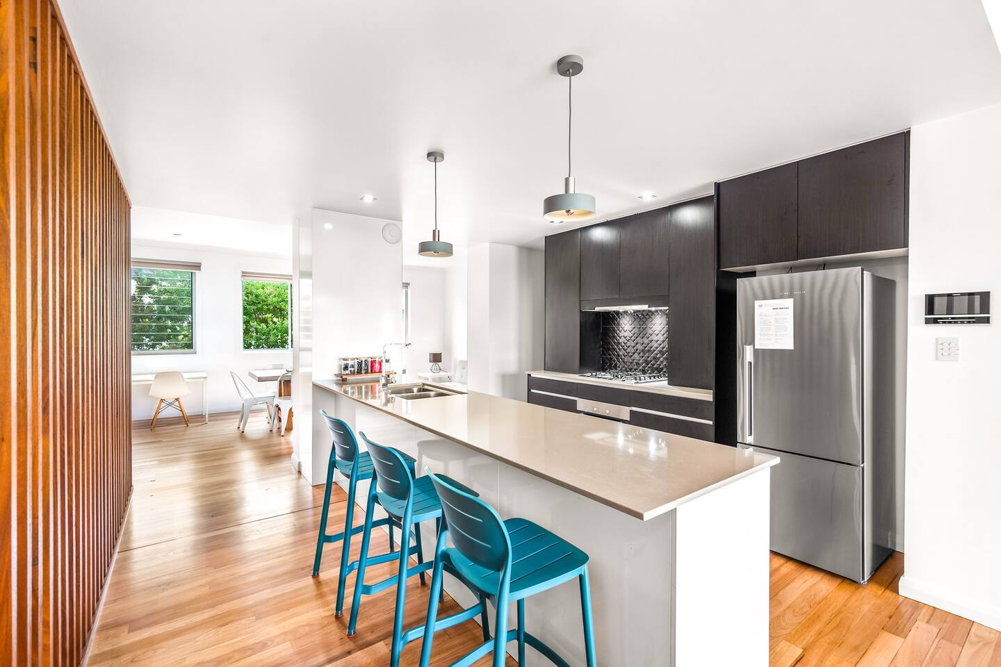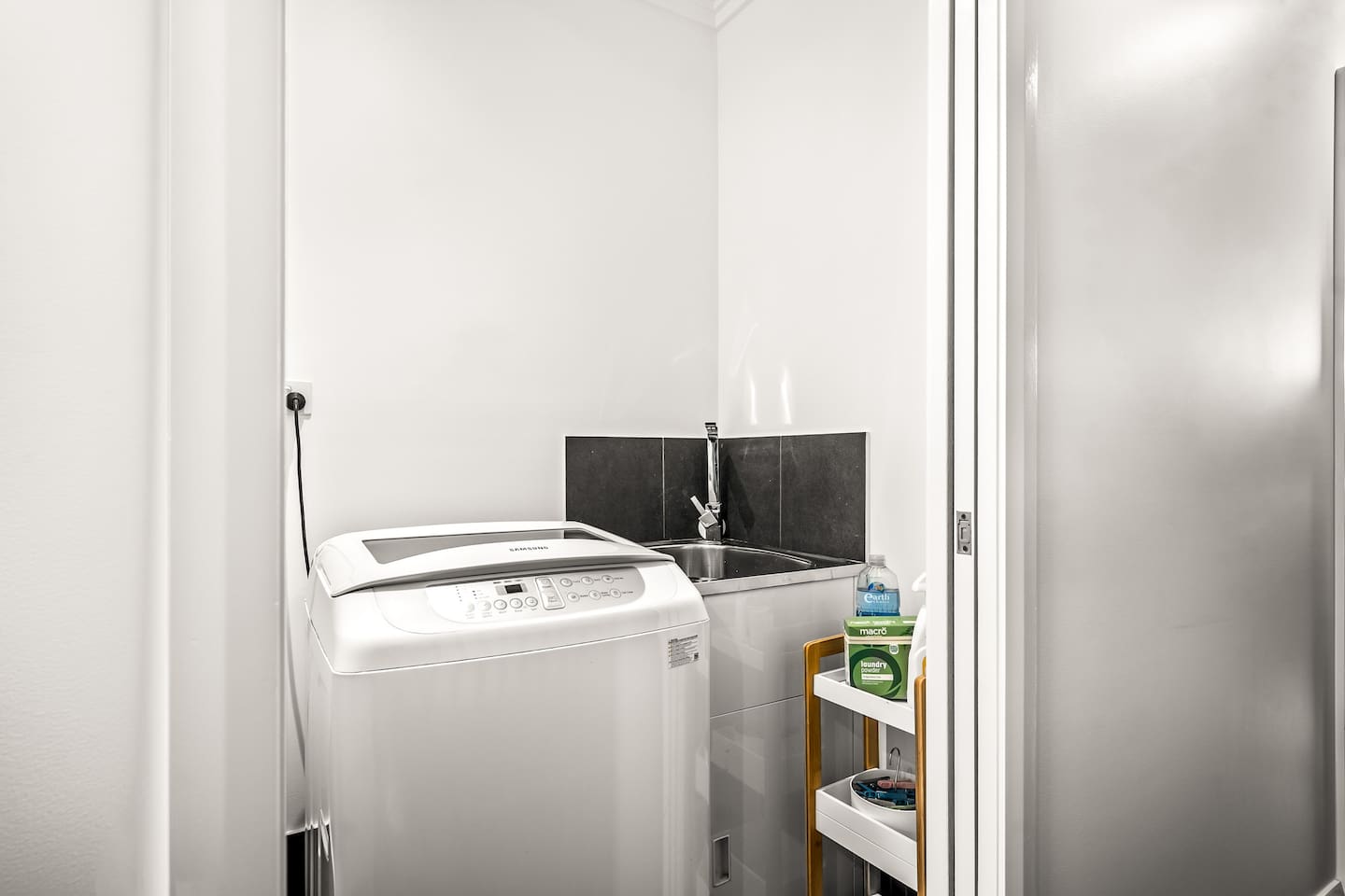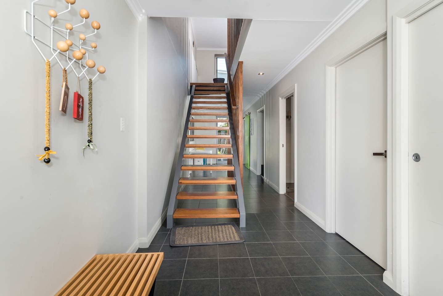 Main (1st) Level →Fully stocked kitchen with microwave, refrigerator, Miele dishwasher, nespresso machine and stove/oven →Pots/pans/dishes/glassware/cutlery, tea, sugar, spices, oil →60" UHD LED Smart TV, NBN internet →Leather lounge →Dining table to seat 8 →Fold-down futon (suits 1 adult or 2 children SINGLE) →Front veranda with chairs and bistro dining set 2nd level → Master Bedroom (king bed) with ensuite (shower, double sinks), walk-in closet →2nd Bedroom (queen bed) with built-in desk space →Bathroom with shower over tub, double sinks →Reading nook Ground level → Bedroom with Queen bed → Bathroom with shower → Washing machine (covered outdoor clothes line/drying rack) → Private covered outdoor back garden with table set seating 6 Note Garage is NOT available to guests