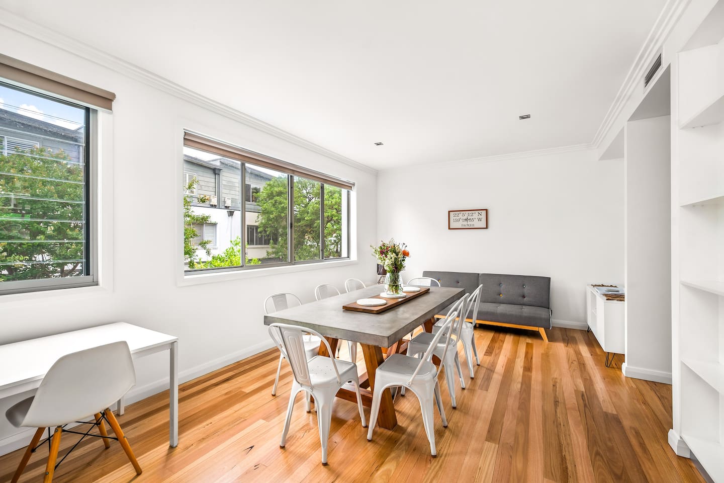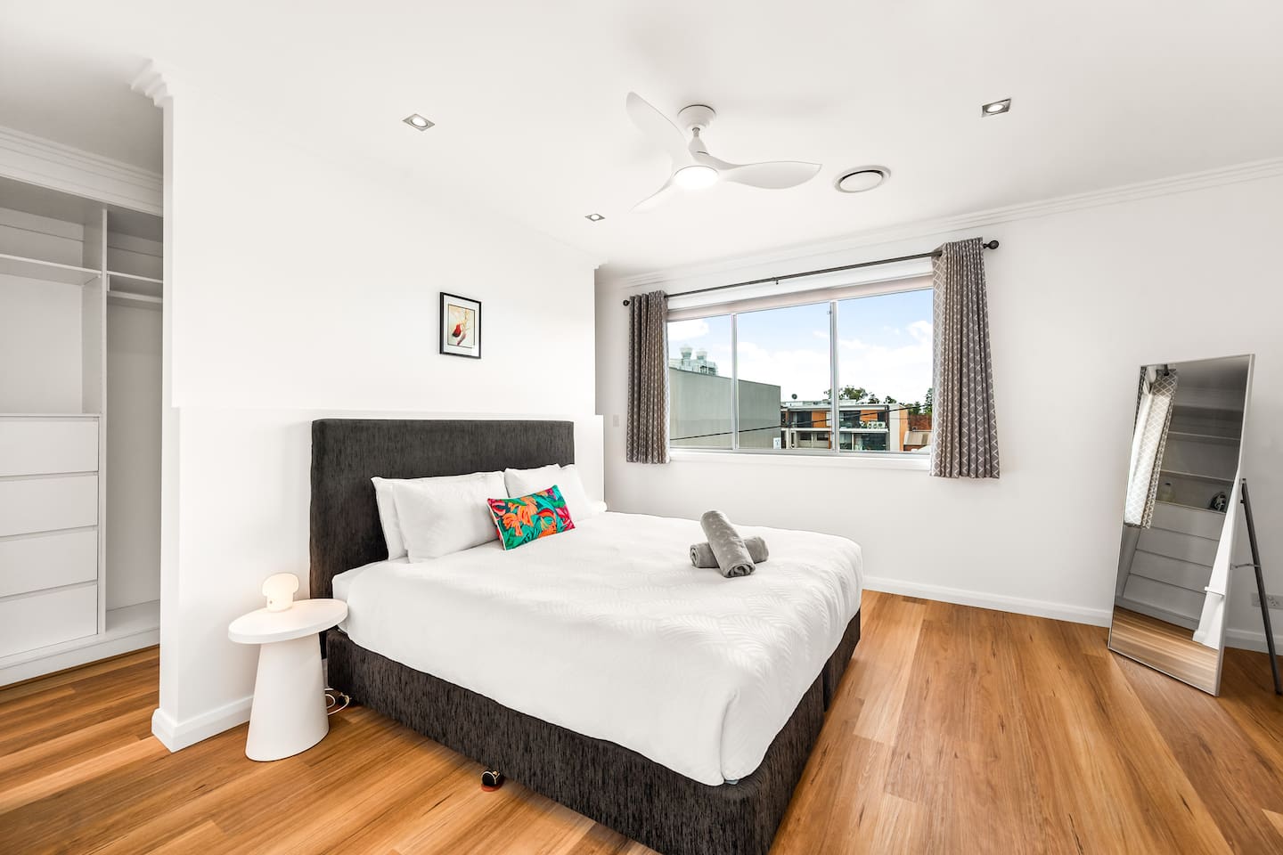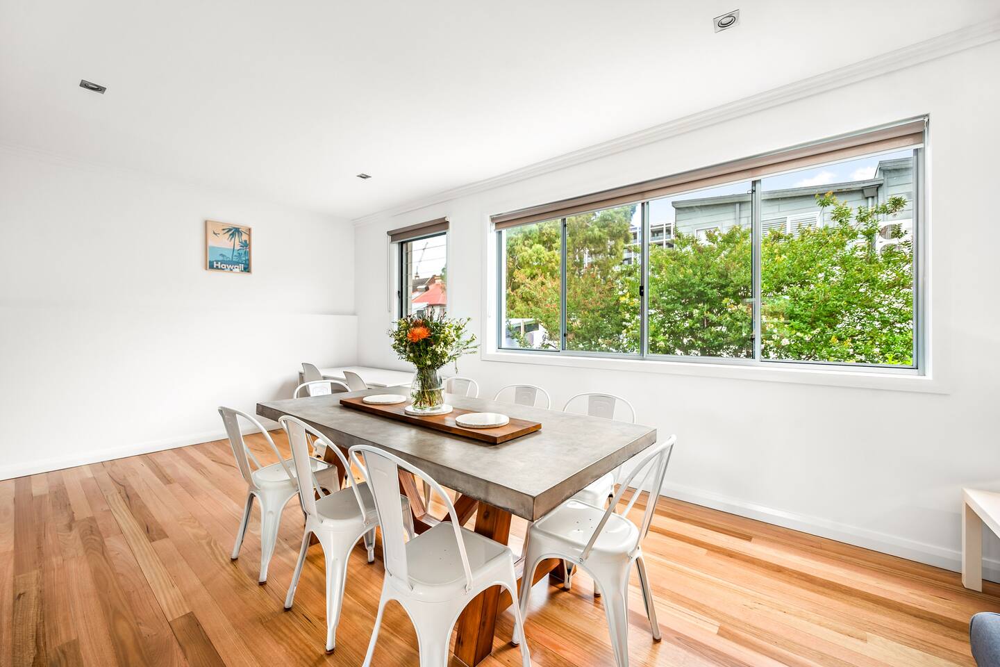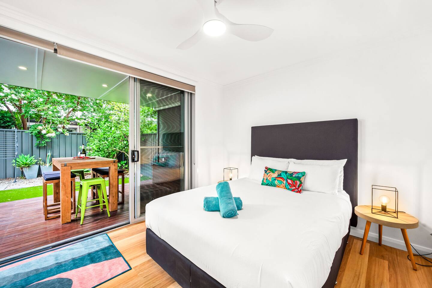 Main (1st) Level →Fully stocked kitchen with microwave, refrigerator, Miele dishwasher, nespresso machine and stove/oven →Pots/pans/dishes/glassware/cutlery, tea, sugar, spices, oil →60" UHD LED Smart TV, NBN internet →Leather lounge →Dining table to seat 8 →Fold-down futon (suits 1 adult or 2 children SINGLE) →Front veranda with chairs and bistro dining set 2nd level → Master Bedroom (king bed) with ensuite (shower, double sinks), walk-in closet →2nd Bedroom (queen bed) with built-in desk space →Bathroom with shower over tub, double sinks →Reading nook Ground level → Bedroom with Queen bed → Bathroom with shower → Washing machine (covered outdoor clothes line/drying rack) → Private covered outdoor back garden with table set seating 6 Note Garage is NOT available to guests